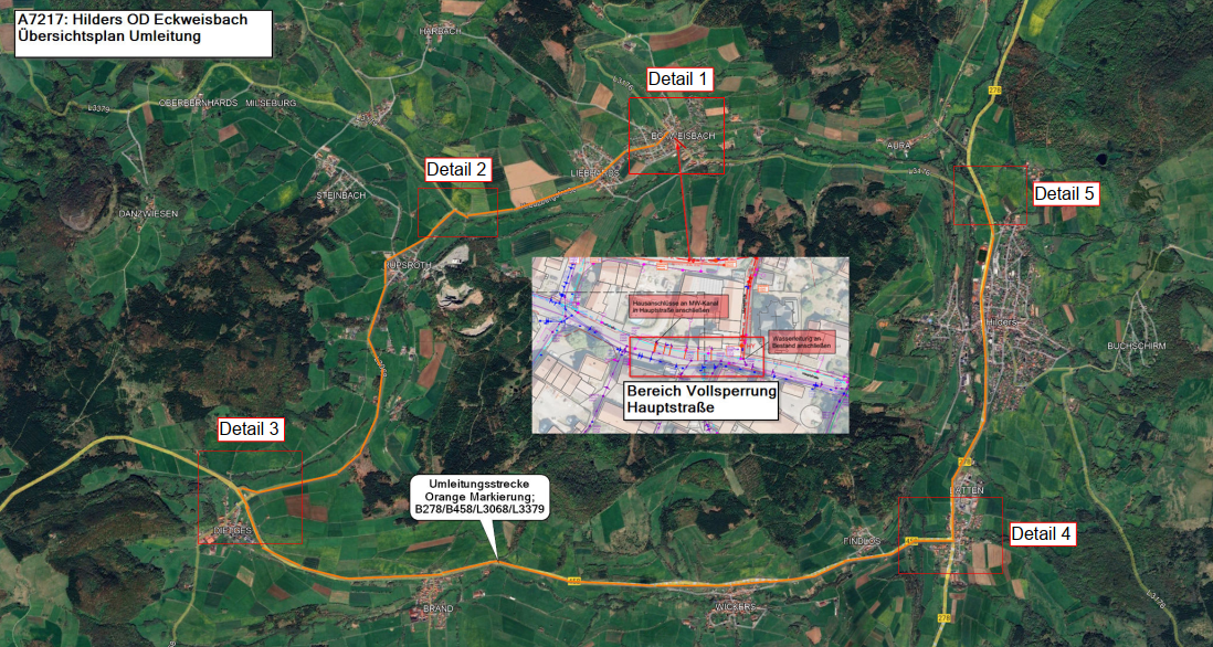 Da die Direktverbindung vom Oberdorf Eckweisbachs nach Hilders und umgekehrt über die L3176 durch diese Vollsperrung gestört ist, wird eine Umleitung eingerichtet. Diese wird von Eckweisbach über Liebhards bis auf die B458 und dann nach Batten bzw. Hilders verlaufen und umgekehrt. Die Umleitung ist im beiliegenden Umleitungsplan einsehbar.