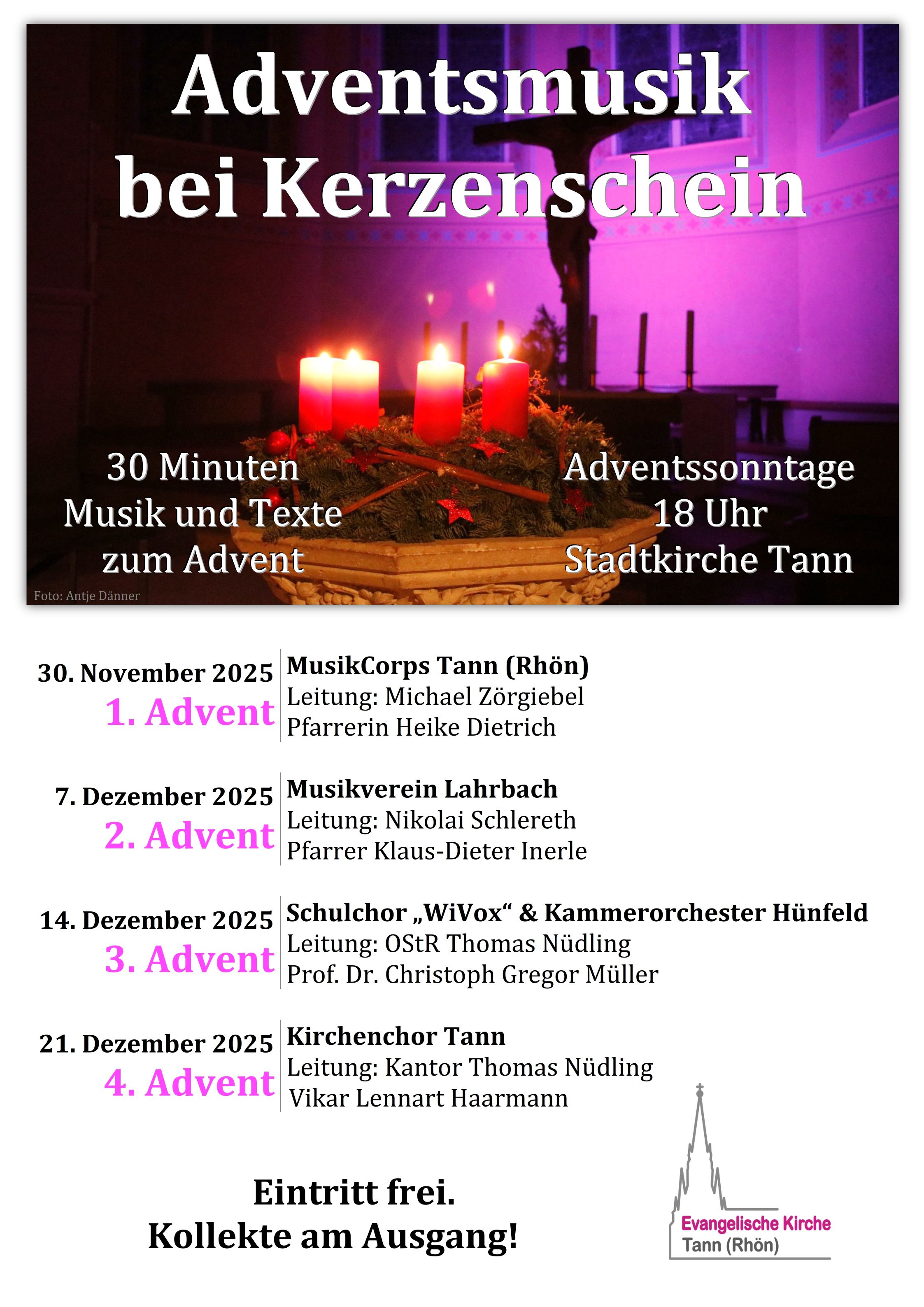 Der Kirchenchor Tann spannt unter der Leitung von Kantor Thomas Nüdling z.B. mit „Rorate coeli“ (Samuel Webbe), „Magnificat“ (Thomas Nüdling) und „Nun komm, der Heiden Heiland“ (Martin Luther) einen Bogen zwischen himmlischer Verheißung und irdischer Sehnsucht. Vikar Lennart Haarmann lässt in seinen Textbeiträgen die Adventszeit in ihrer ganzen Spannung und Schönheit erfahrbar werden – lichtvoll und voller Erwartung.