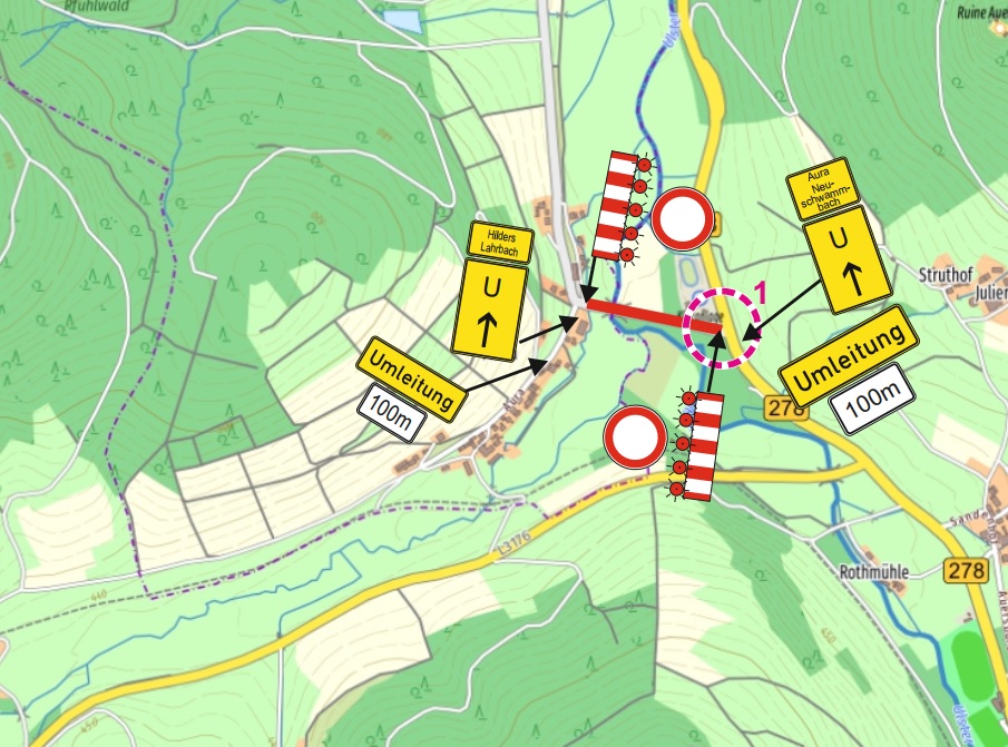 Im markierten Bereich finden in der Zeit vom 30.03.2026 bis zum 07.04.2026 Baumpflegearbeiten statt.