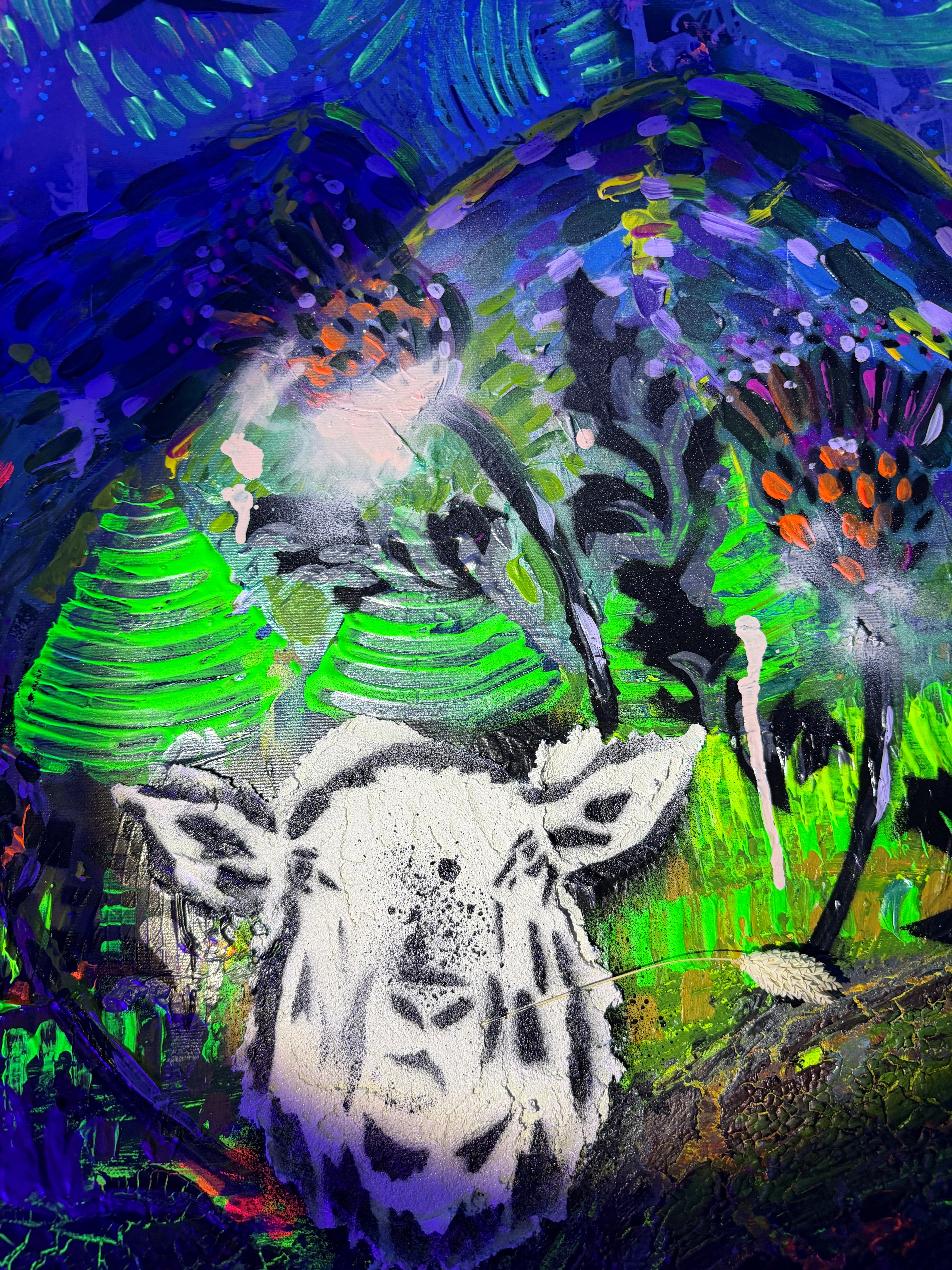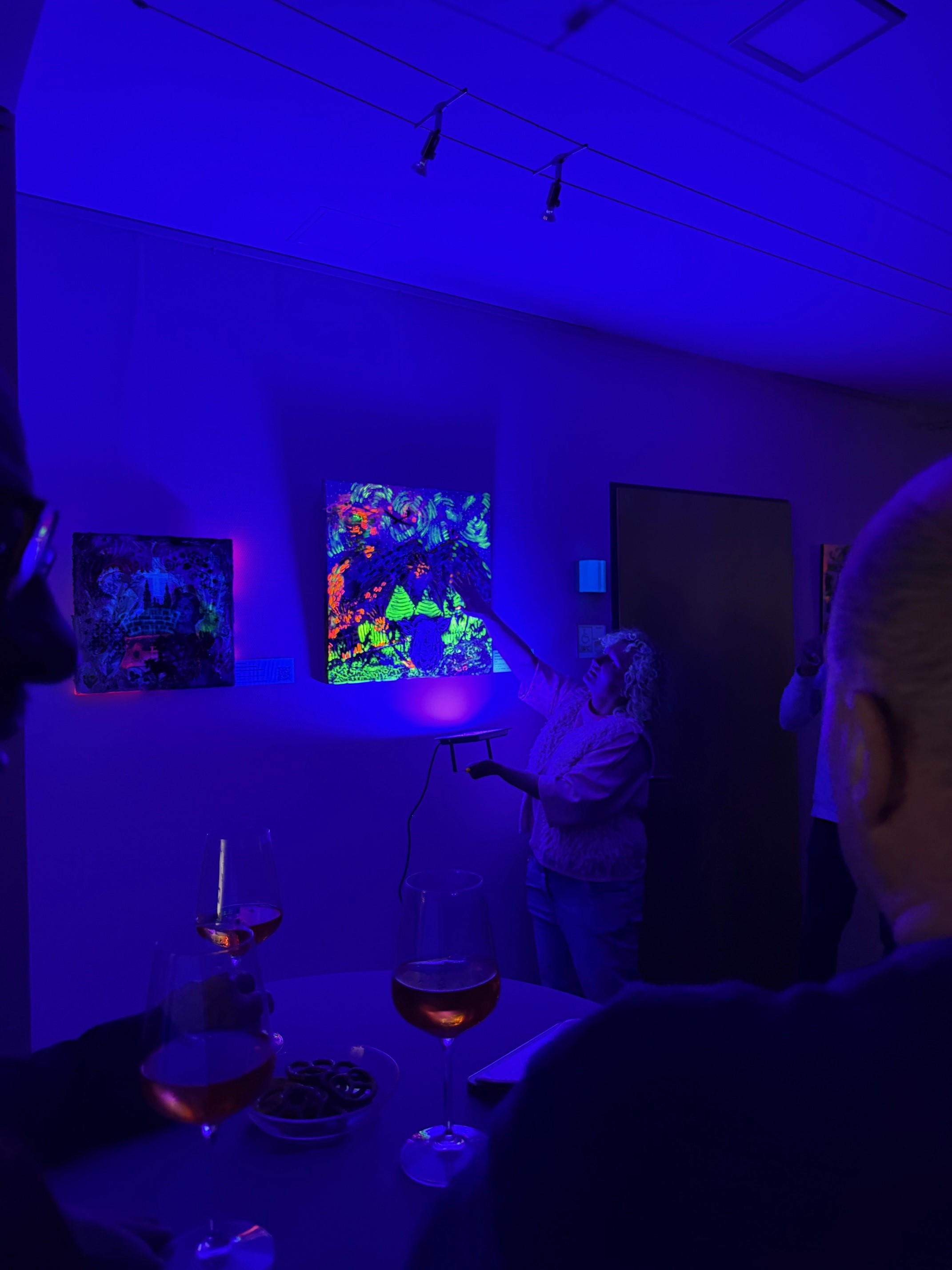 Am 30.03.2026 feierte die Künstlerin die Vernissage zur aktuellen Ausstellung in der Rhöngemeinde Hilders – eine Vernissage ganz anderer Art: BUNT, ausgelassen und mit guten Beats untermalt. Viele Besucherinnen und Besucher haben sich von den Bildern, die unter UV-Licht erst ihr ganzes Geheimnis zeigen, verzaubern lassen. Besonders Bürgermeister Günkel, der nach seinem Urlaub von der Ausstellung überrascht wurde und selbst bekennender Kunstliebhaber ist, schwärmt: „Für mich ist es eine ganz besondere Ausstellung, die sich nicht nur hinsichtlich ihrer Farbvielfalt von vielen anderen absetzt. Gerade die Veränderung der Blickwinkel und die Tiefe der Bilder lädt die Betrachter zum Verweilen ein“.