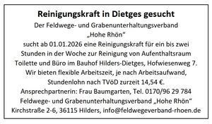 Der Feldwege- und Grabenunterhaltungsverband „Hohe Rhön“ sucht ab 01.01.2026 eine Reinigungskraft...
